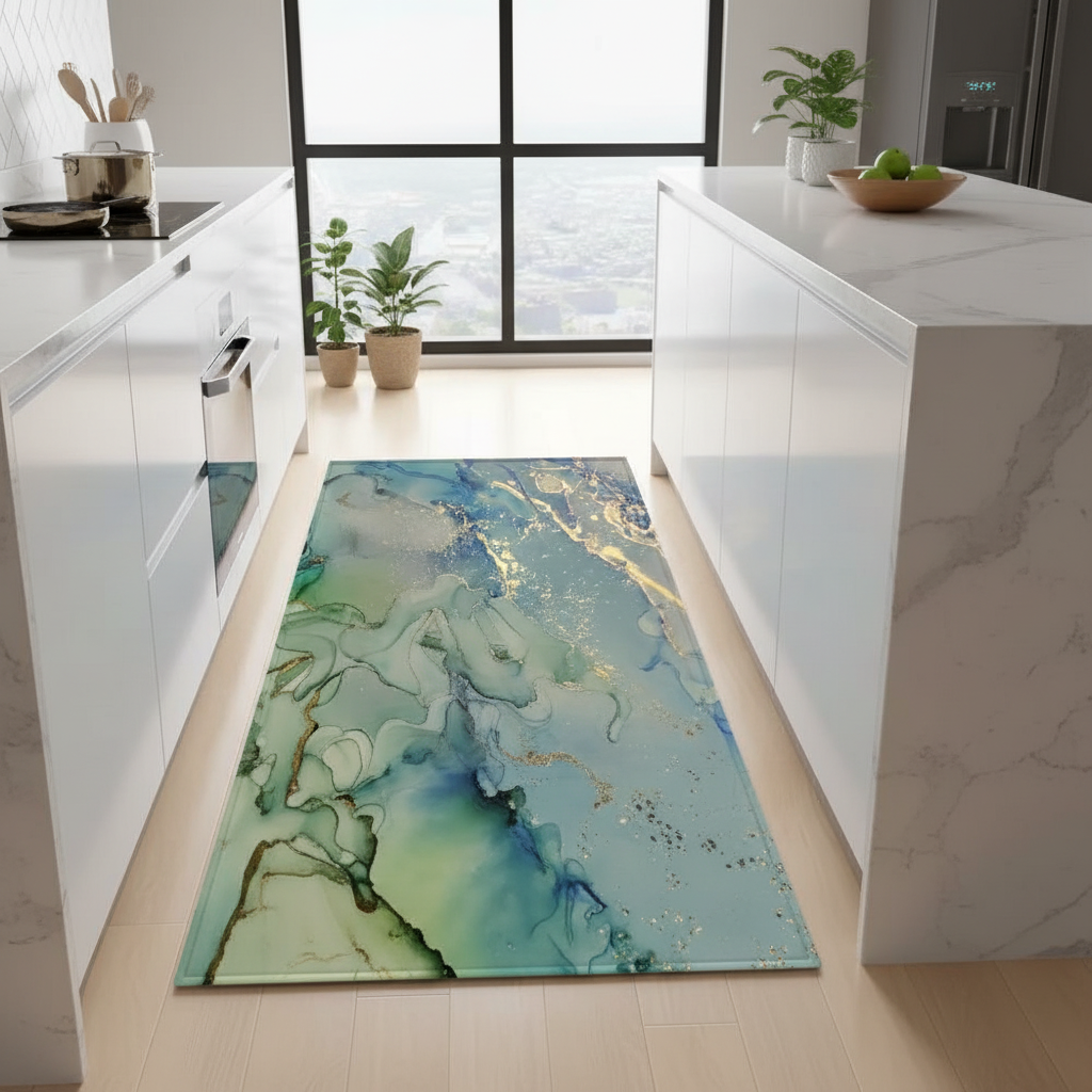 Ce **tapis de cuisine abstrait** apporte une touche artistique et moderne à votre espace. Son design unique aux nuances de **bleu** et aux accents **or** lumineux dynamise instantanément l'esthétique de votre cuisine.