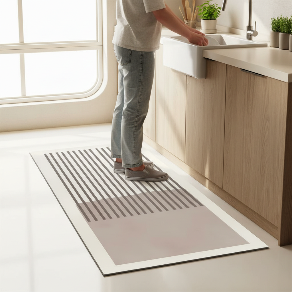 Ce Tapis Cuisine beige à rayures antidérapant est parfait pour protéger votre sol des éclaboussures et de l'usure quotidienne, tout en apportant une touche décorative moderne. Il améliore le confort sous les pieds lors de vos activités culinaires, rendant votre cuisine plus agréable et fonctionnelle.