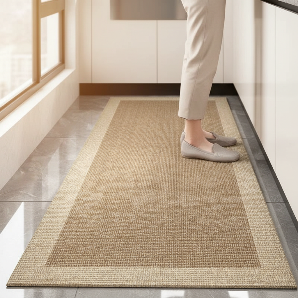 Ce tapis de cuisine bicolore beige apporte style et sécurité à votre espace culinaire.