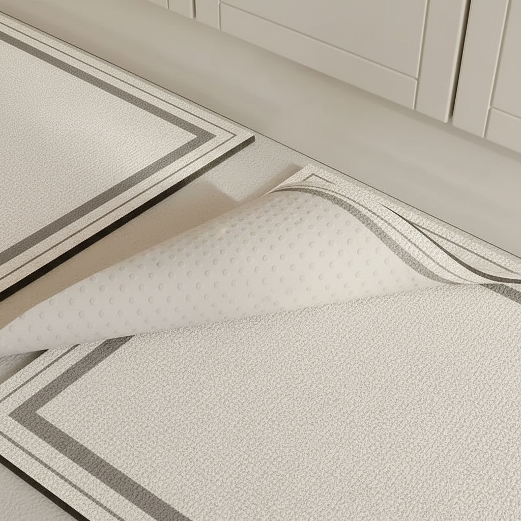 Ce set de tapis de cuisine offre une solution à la fois esthétique et pratique pour votre espace culinaire. Avec sa couleur beige et sa bordure moderne, il apporte une touche de sophistication tout en protégeant votre sol.
