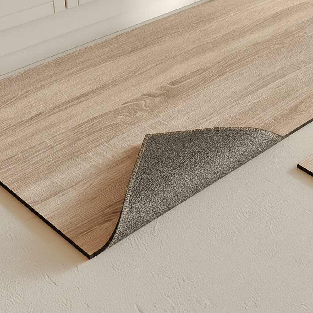Ajoutez une touche de style naturel et de sécurité à votre cuisine avec notre tapis beige effet bois.