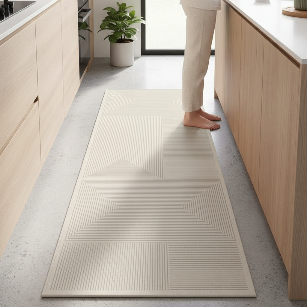 Ce tapis de cuisine combine un design géométrique moderne avec une teinte beige douce, apportant une touche harmonieuse et fonctionnelle à votre espace culinaire. Conçu pour le confort et la sécurité, il est également antidérapant et lavable pour une hygiène impeccable.