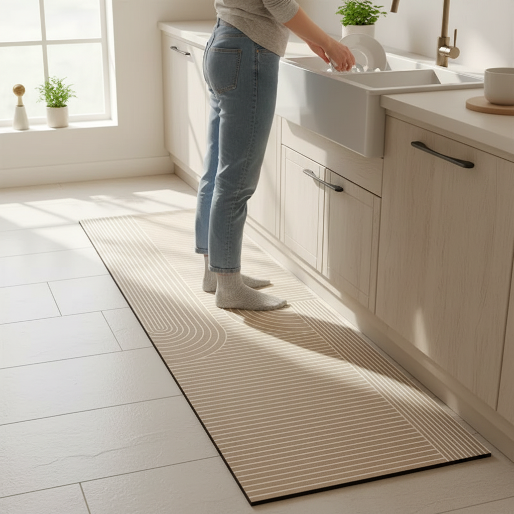 Ajoutez une touche de style moderne et de confort à votre cuisine avec ce tapis beige géométrique.