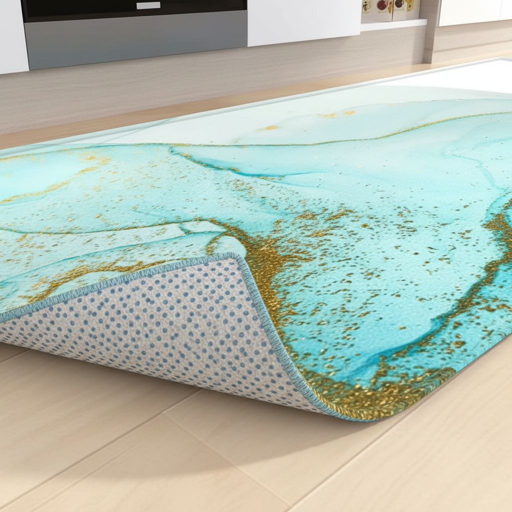 Ce tapis de cuisine arbore un design abstrait captivant aux nuances de bleu et d'accents dorés, idéal pour moderniser votre espace. Fabriqué en 100% polyester, il allie esthétique et fonctionnalité.