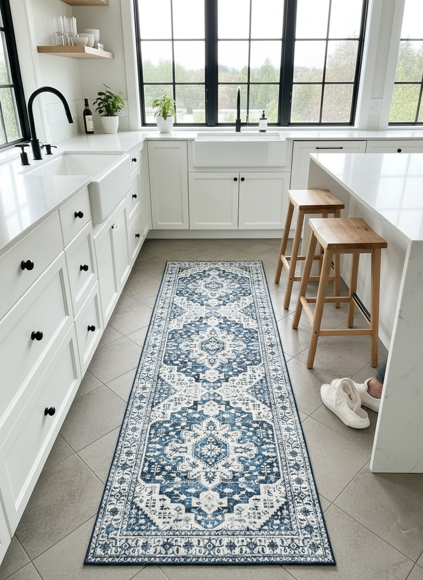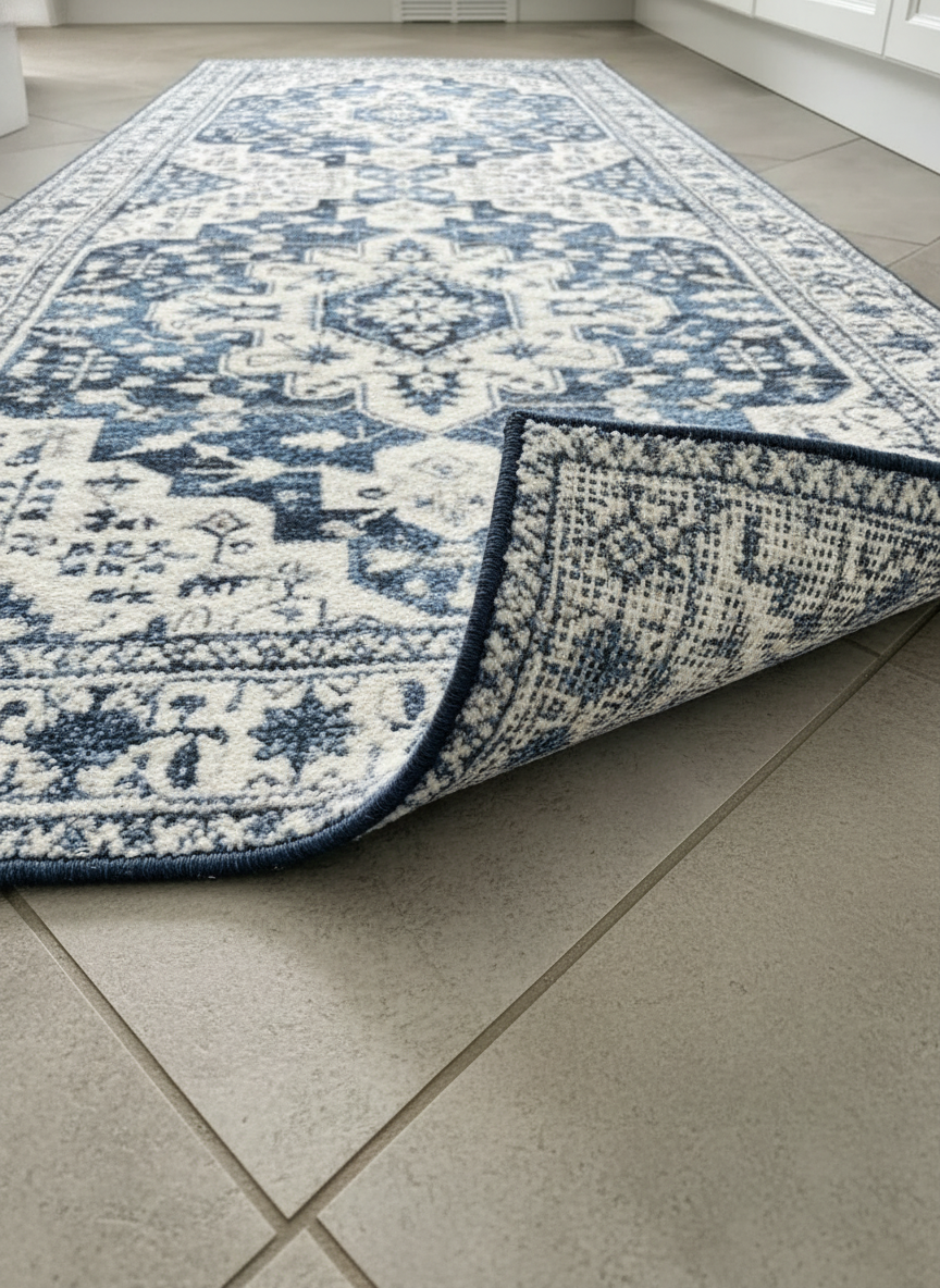 Découvrez la qualité et le design de notre Tapis Cuisine bleu blanc motif vintage lavable. Parfait pour protéger votre sol, ajouter une touche décorative et profiter d’un confort optimal au quotidien dans votre cuisine.