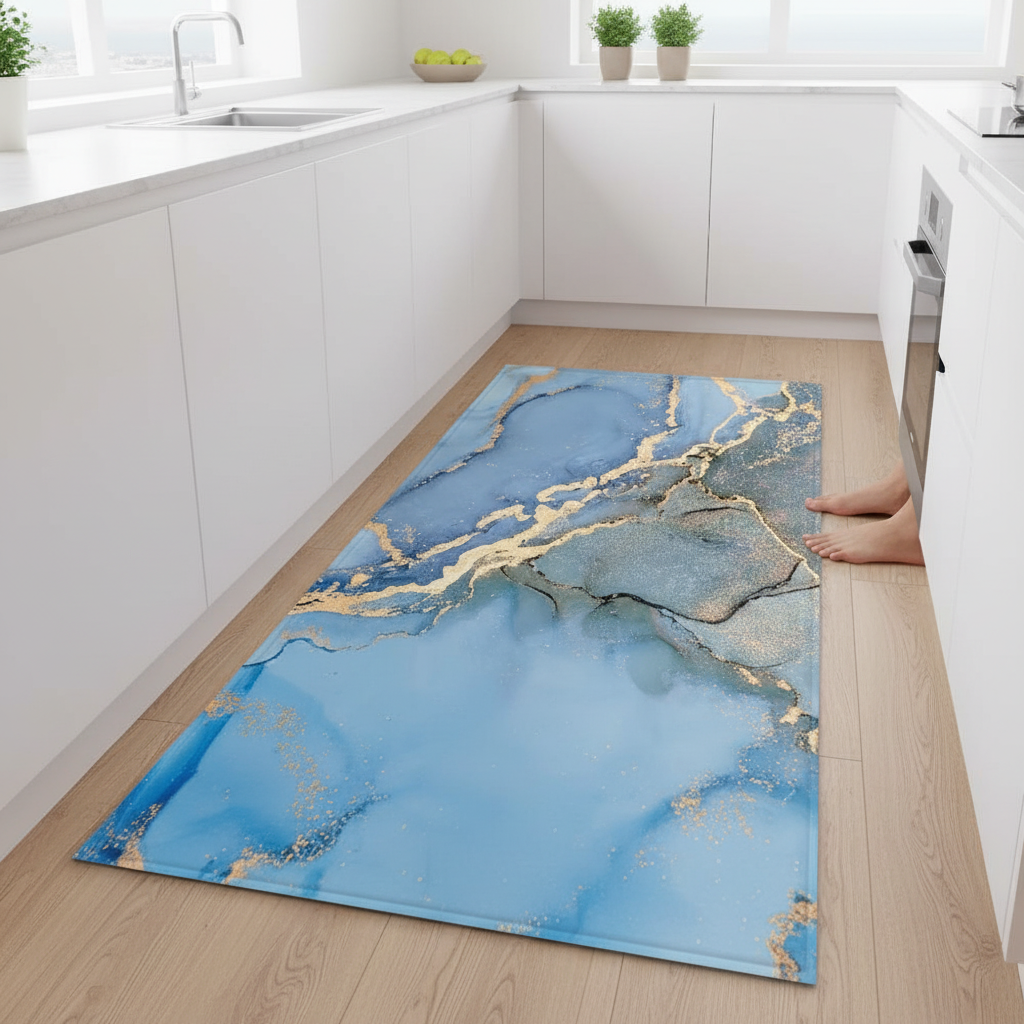 Apportez une touche d'élégance moderne et de confort à votre cuisine avec ce tapis bleu marbré.