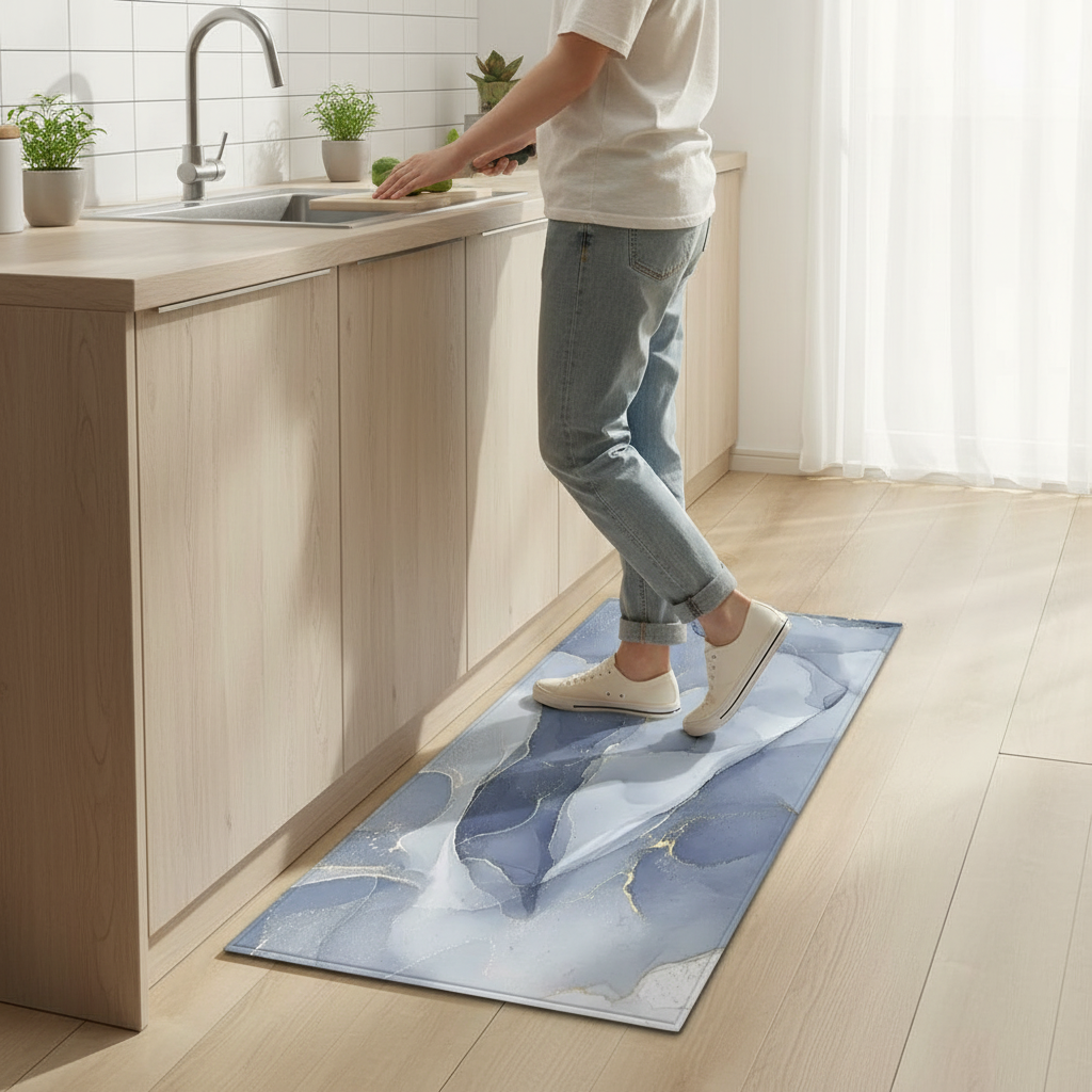 Usage quotidien du Tapis Cuisine bleu marbré antidérapant luxueux