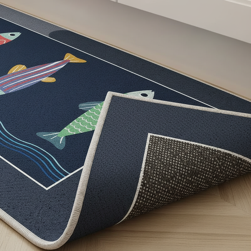 Apportez une touche marine et ludique à votre cuisine avec ce tapis bleu marine orné de poissons, conçu pour combiner style et sécurité.