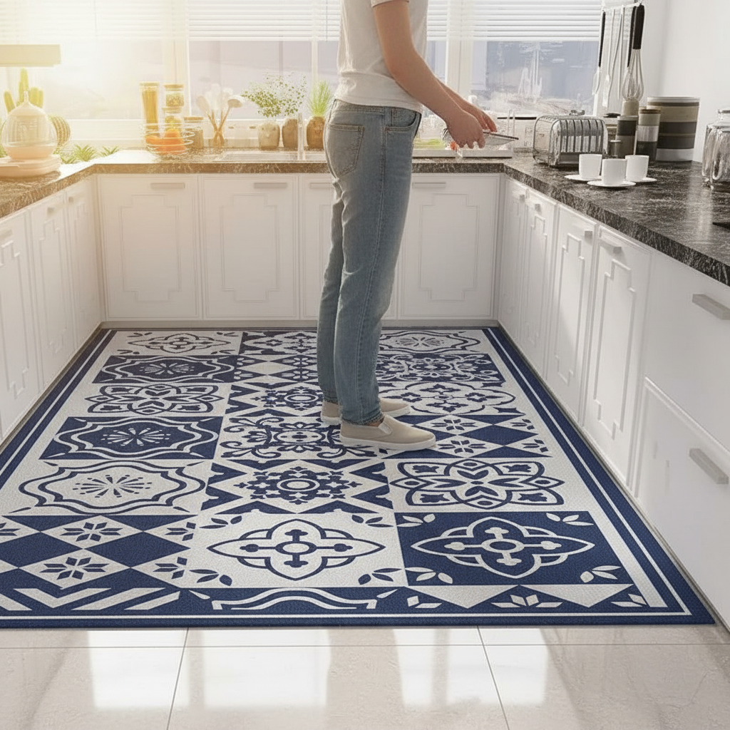 Apportez une touche de style et de fonctionnalité à votre cuisine avec ce tapis bleu aux motifs carreaux.