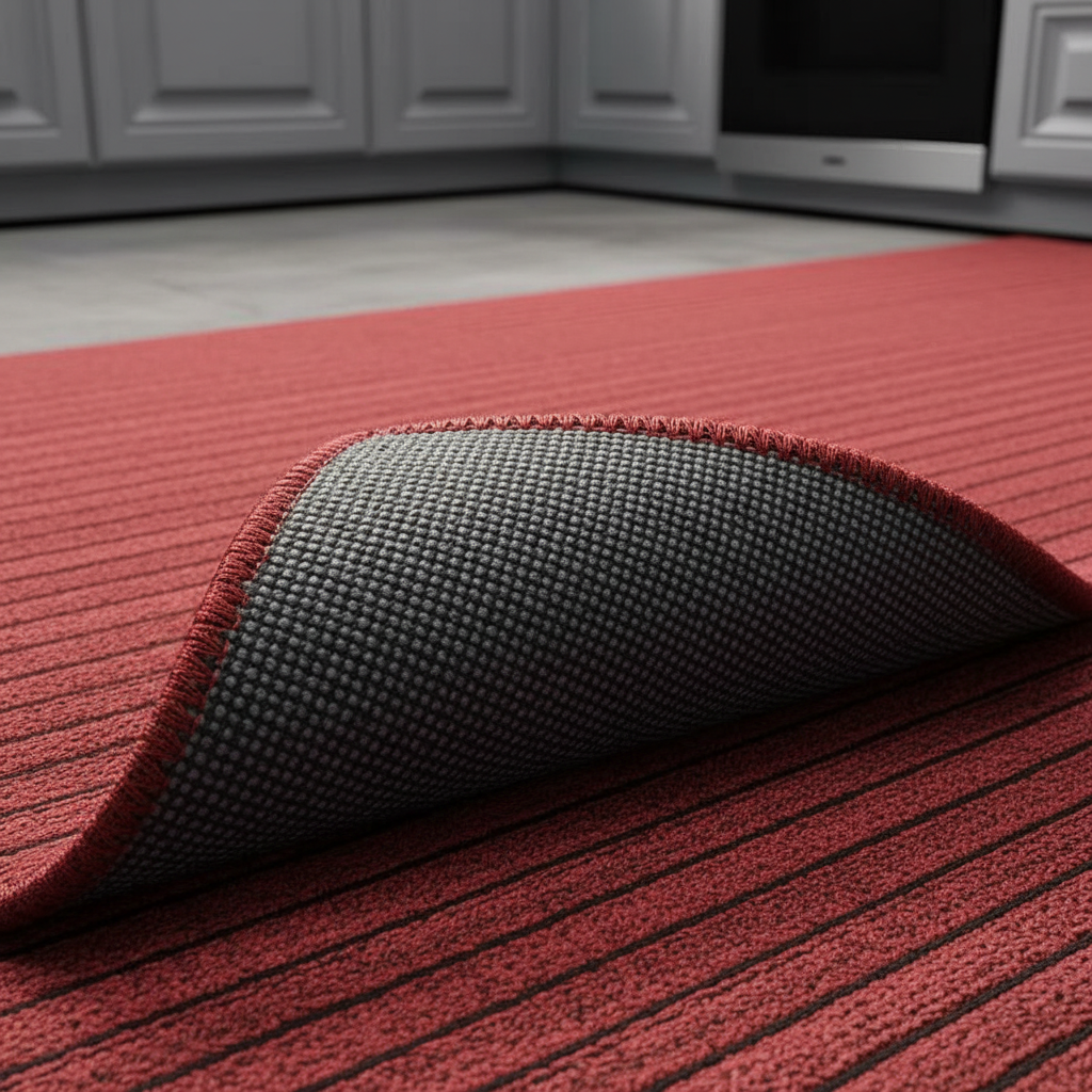 Ajoutez une touche d'élégance et de sécurité à votre cuisine avec ce tapis bordeaux rayé.