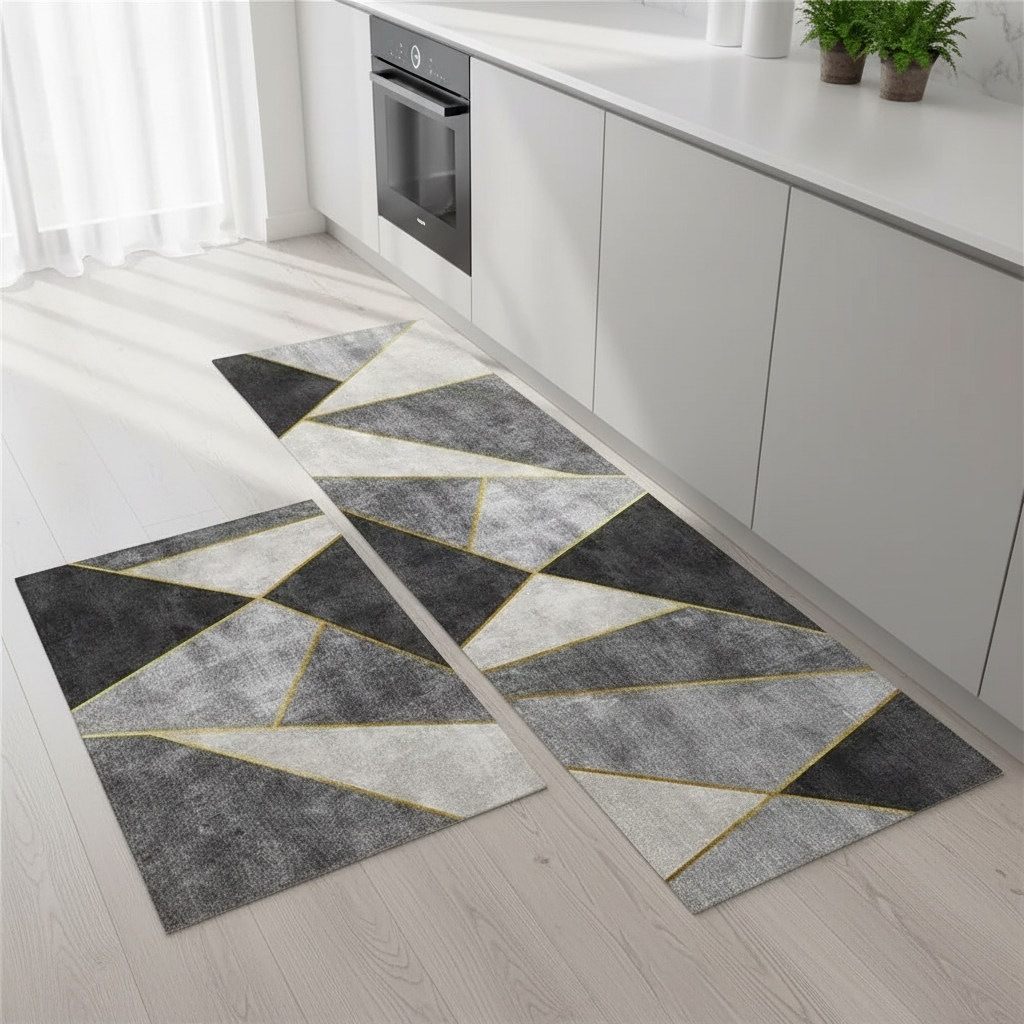Ajoutez une touche moderne et sécurisée à votre cuisine avec ce tapis design géométrique gris antidérapant.