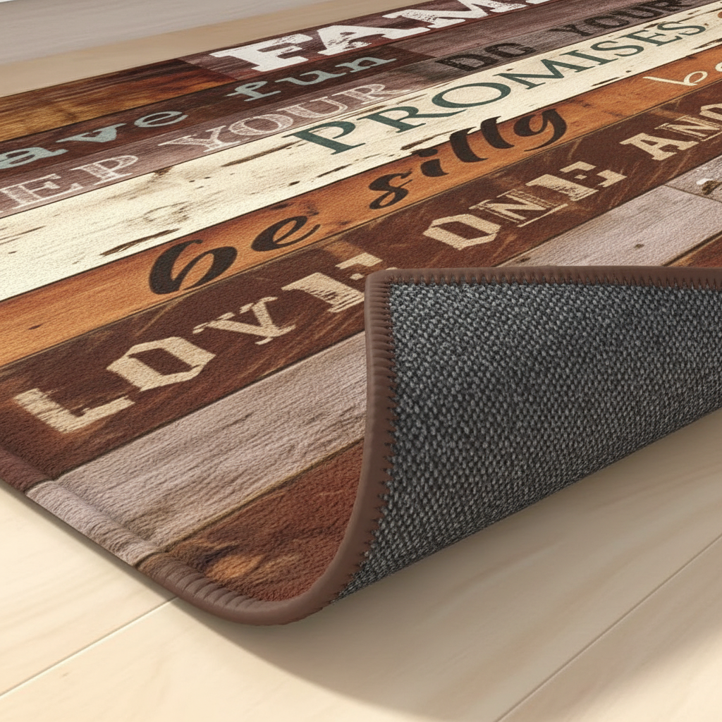 Apportez une touche de charme rustique et inspirante à votre cuisine avec ce tapis antidérapant effet bois orné de citations motivantes.