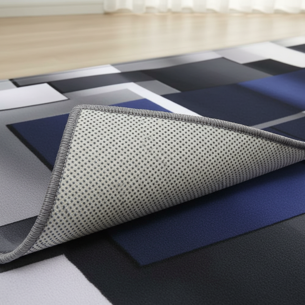 - Son motif géométrique 3D unique, mélangeant des teintes de bleu profond, de gris, de blanc et de noir, ajoute une dimension visuelle contemporaine à votre sol.