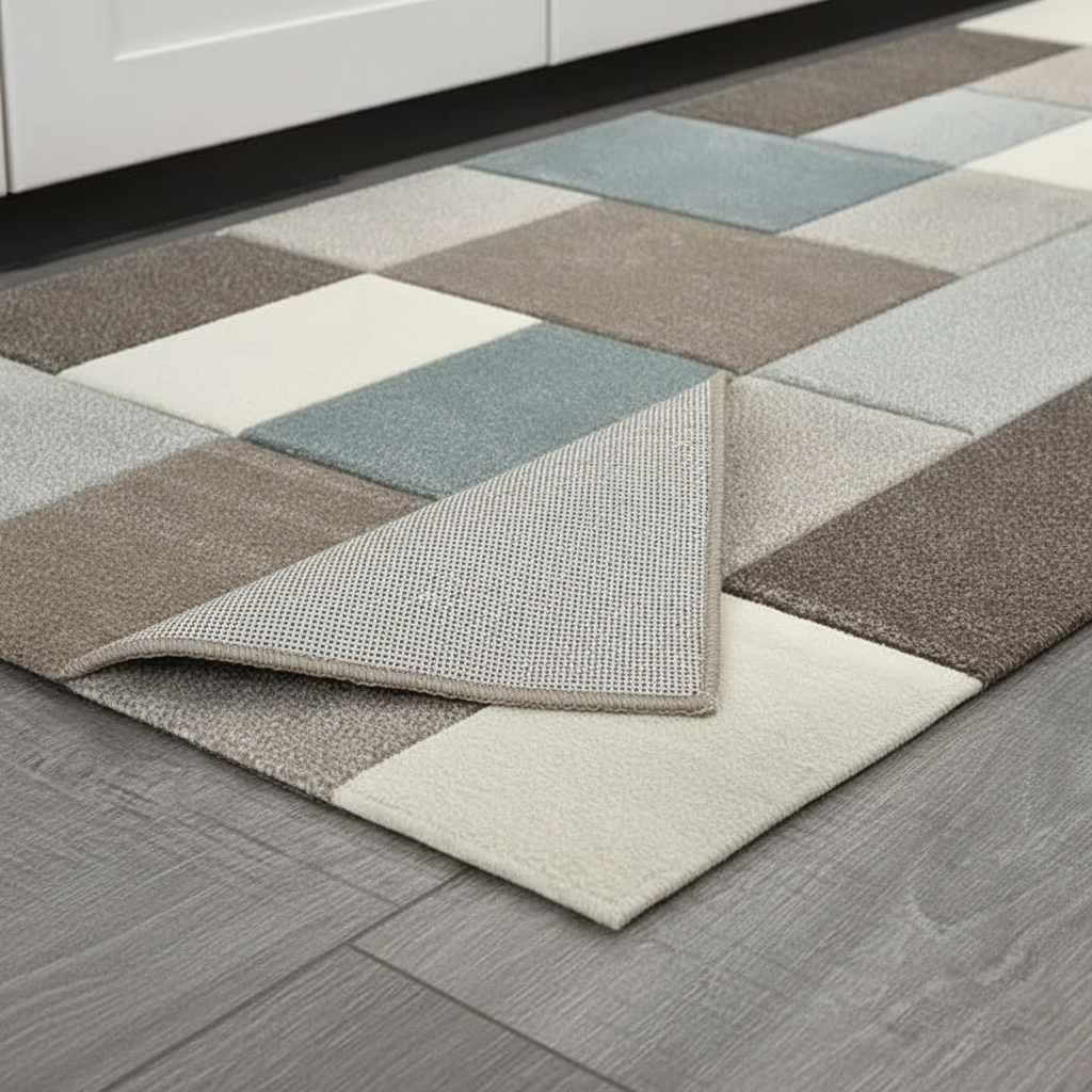 Ce tapis de cuisine géométrique bleu-gris ajoute une touche moderne et sécurisée à votre espace culinaire.