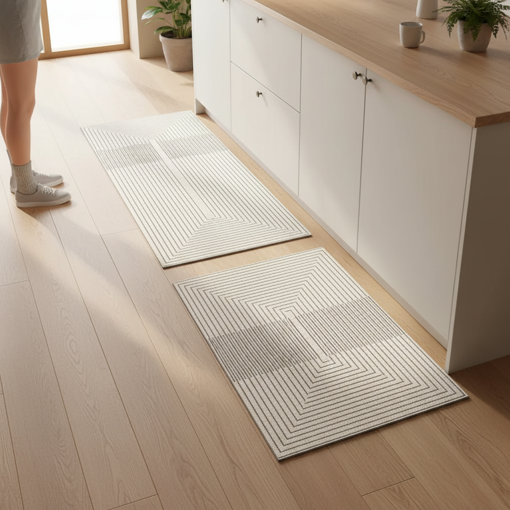 Découvrez ce set de tapis de cuisine au design géométrique moderne, parfait pour ajouter une touche contemporaine à votre espace. Conçus pour la praticité, ils sont également antidérapants pour une sécurité optimale.