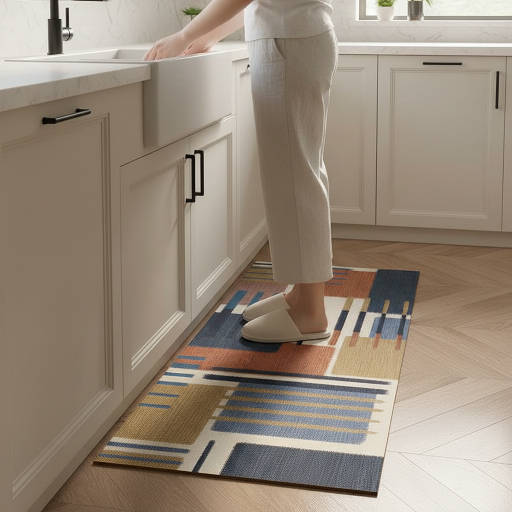 Ce tapis de cuisine présente un motif géométrique contemporain, idéal pour ajouter une touche de modernité et de couleur à votre espace. Fabriqué en PVC Leather, il combine esthétique et fonctionnalité pour un usage quotidien.