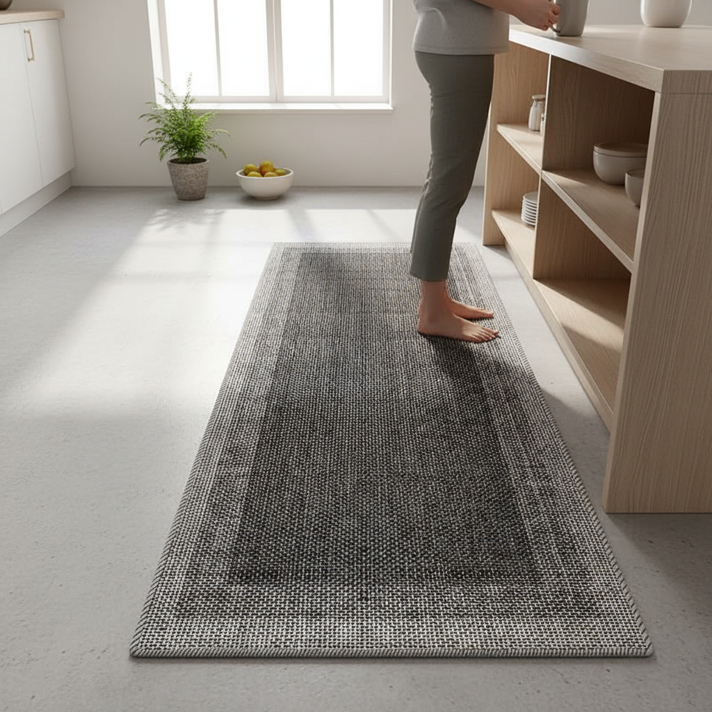 Ce **tapis cuisine gris chiné long antidérapant** s'intègre parfaitement dans votre quotidien en offrant confort et protection du sol. Il est idéal pour les zones de passage, réduisant la fatigue et ajoutant une touche décorative moderne à votre **cuisine**.