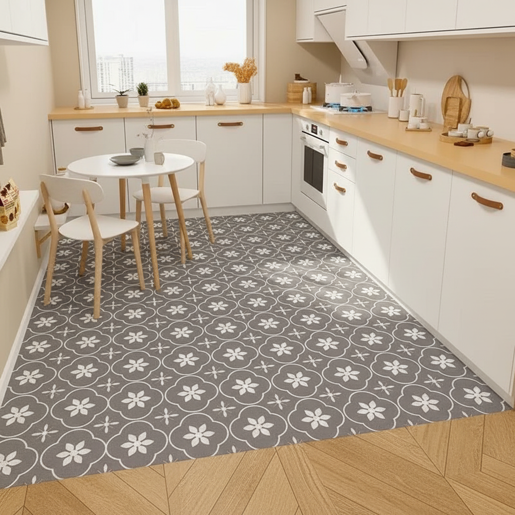 Apportez une touche d'élégance et de sécurité à votre cuisine avec ce tapis gris au motif floral antidérapant.