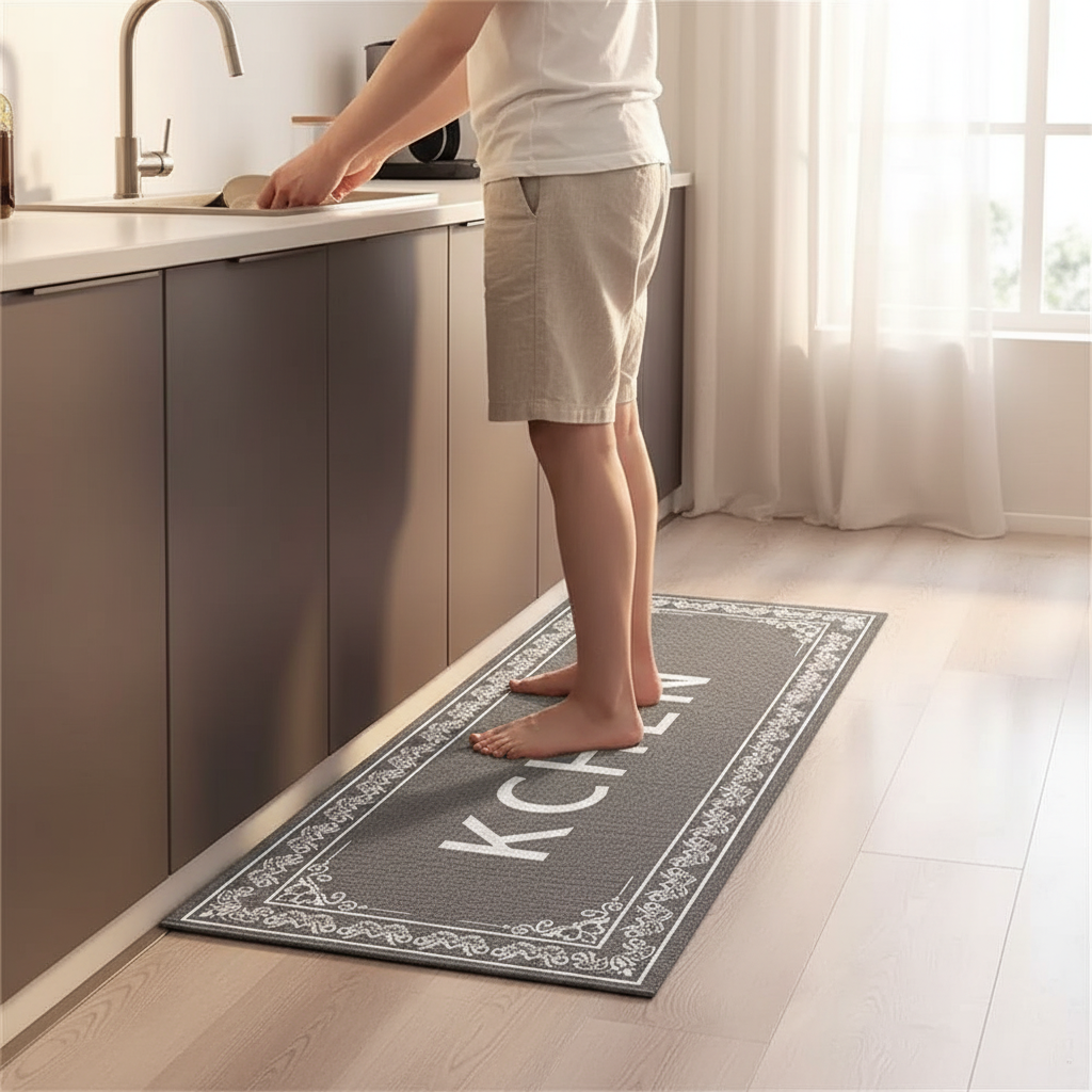 Ajoutez une touche d'élégance vintage et de confort à votre cuisine avec ce tapis gris lavable.