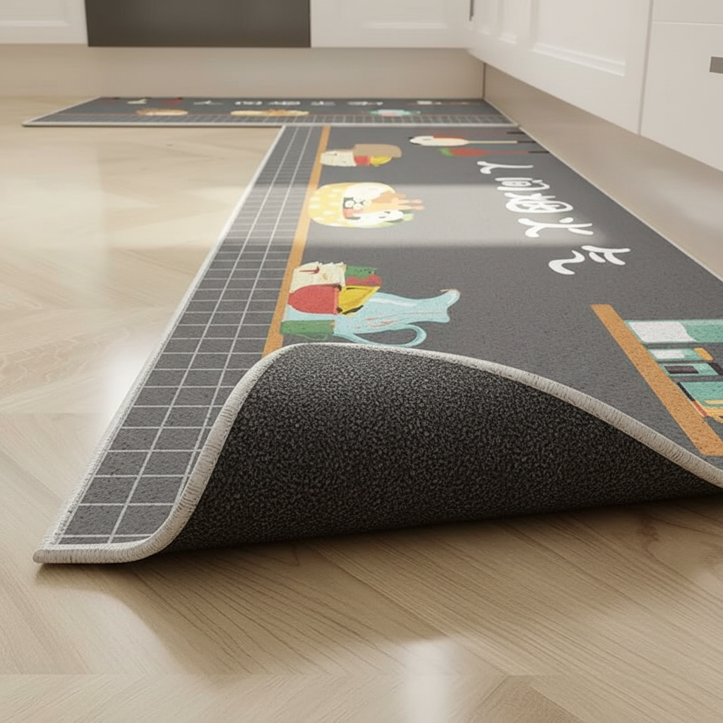 Ajoutez une touche de gaieté et de sécurité à votre cuisine avec ce tapis gris aux motifs amusants.