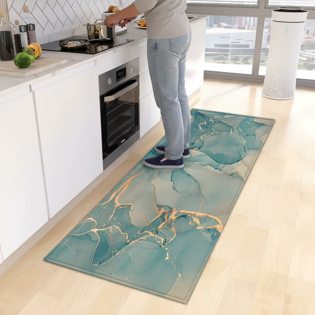 Tapis Cuisine marbré turquoise doré antidérapant pour un style unique