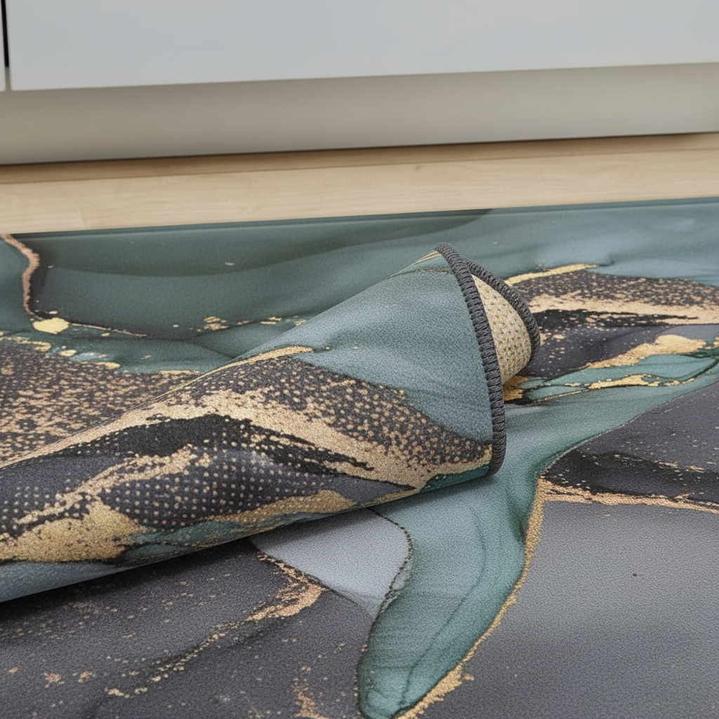Ce tapis de cuisine présente un design marbré élégant, combinant des nuances de vert profond, de gris et des touches dorées. Idéal pour apporter une touche de sophistication moderne à votre espace culinaire, tout en étant antidérapant.