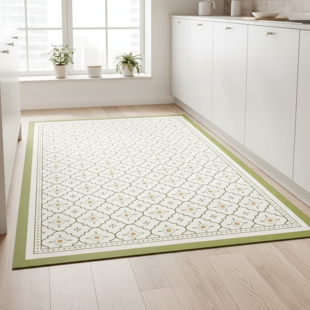 Apportez une touche de style et de sécurité à votre cuisine avec ce tapis antidérapant au motif carreaux vert et crème.