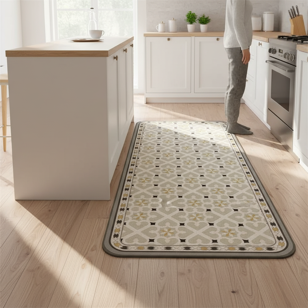 Apportez style et fonctionnalité à votre cuisine avec notre tapis antidérapant au motif géométrique beige.