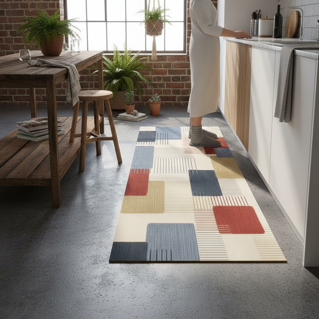 Ajoutez une touche de modernité et de couleur à votre cuisine avec ce tapis géométrique et pratique.