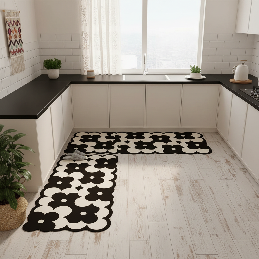 Ajoutez une touche de style moderne et de sécurité à votre cuisine avec notre tapis floral antidérapant noir et blanc.
