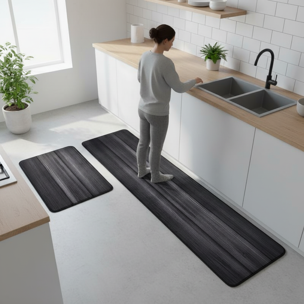 Ce tapis de cuisine noir avec motif bois apporte style et sécurité à votre espace culinaire.