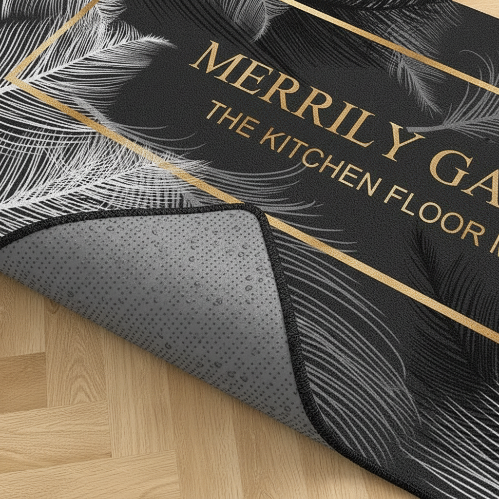 - Le design inclut l'inscription "MERRILY GATHER THE KITCHEN FLOOR MATS", ajoutant une touche accueillante et distinctive.