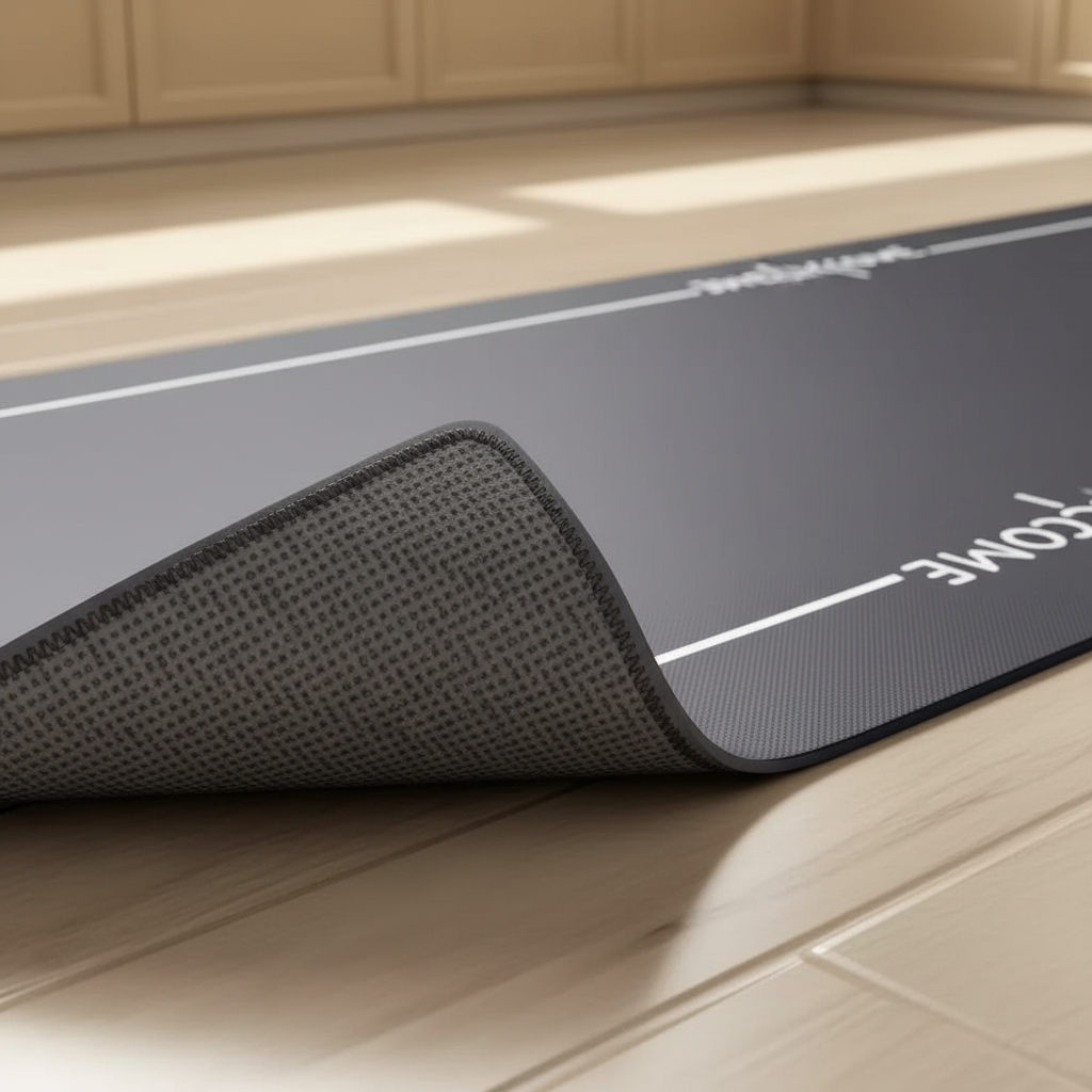 Ajoutez une touche d'élégance et de sécurité à votre cuisine avec ce tapis noir "welcome" antidérapant.