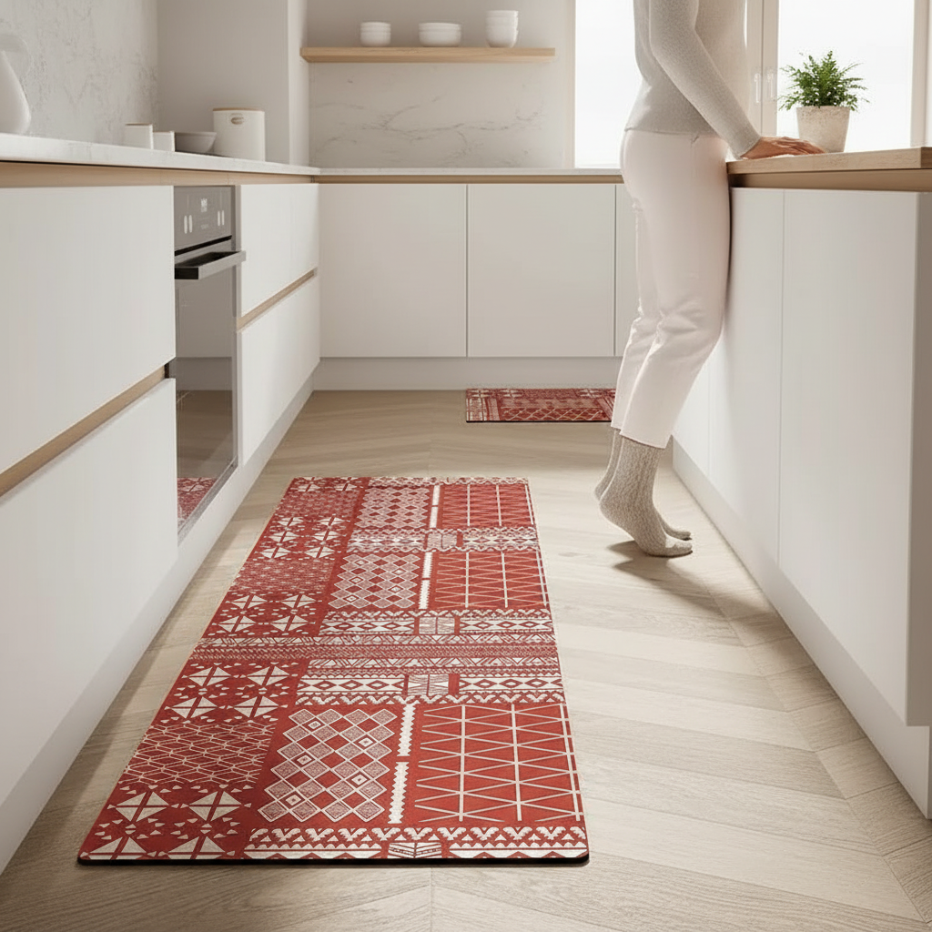 Apportez une touche de style moderne et de sécurité à votre cuisine avec ce tapis rouge aux motifs géométriques.