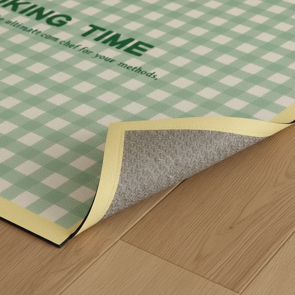 Ce tapis de cuisine présente un motif à carreaux vert menthe frais, bordé d'une teinte jaune pâle, et inclut l'inscription "COOKING TIME". Il est conçu pour ajouter une touche de style et de praticité à votre espace culinaire.