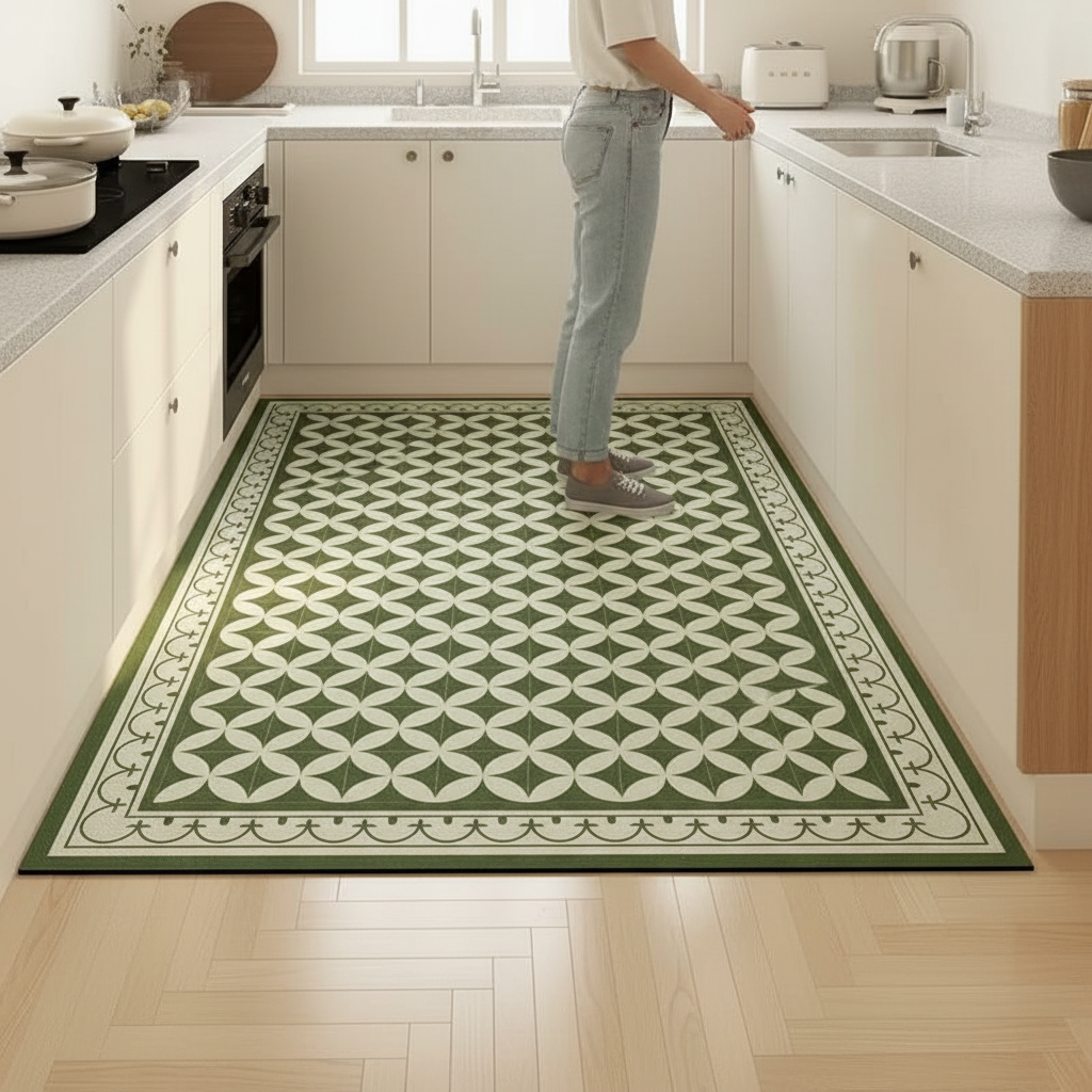 Usage du Tapis Cuisine Vert Motif Géométrique Antidérapant au Quotidien