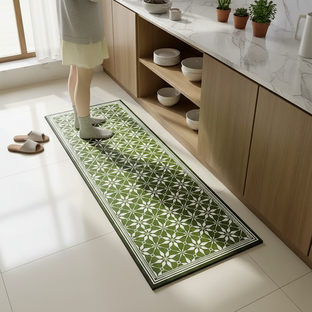 Usage et avantages du Tapis Cuisine vert motif géométrique antidérapant original